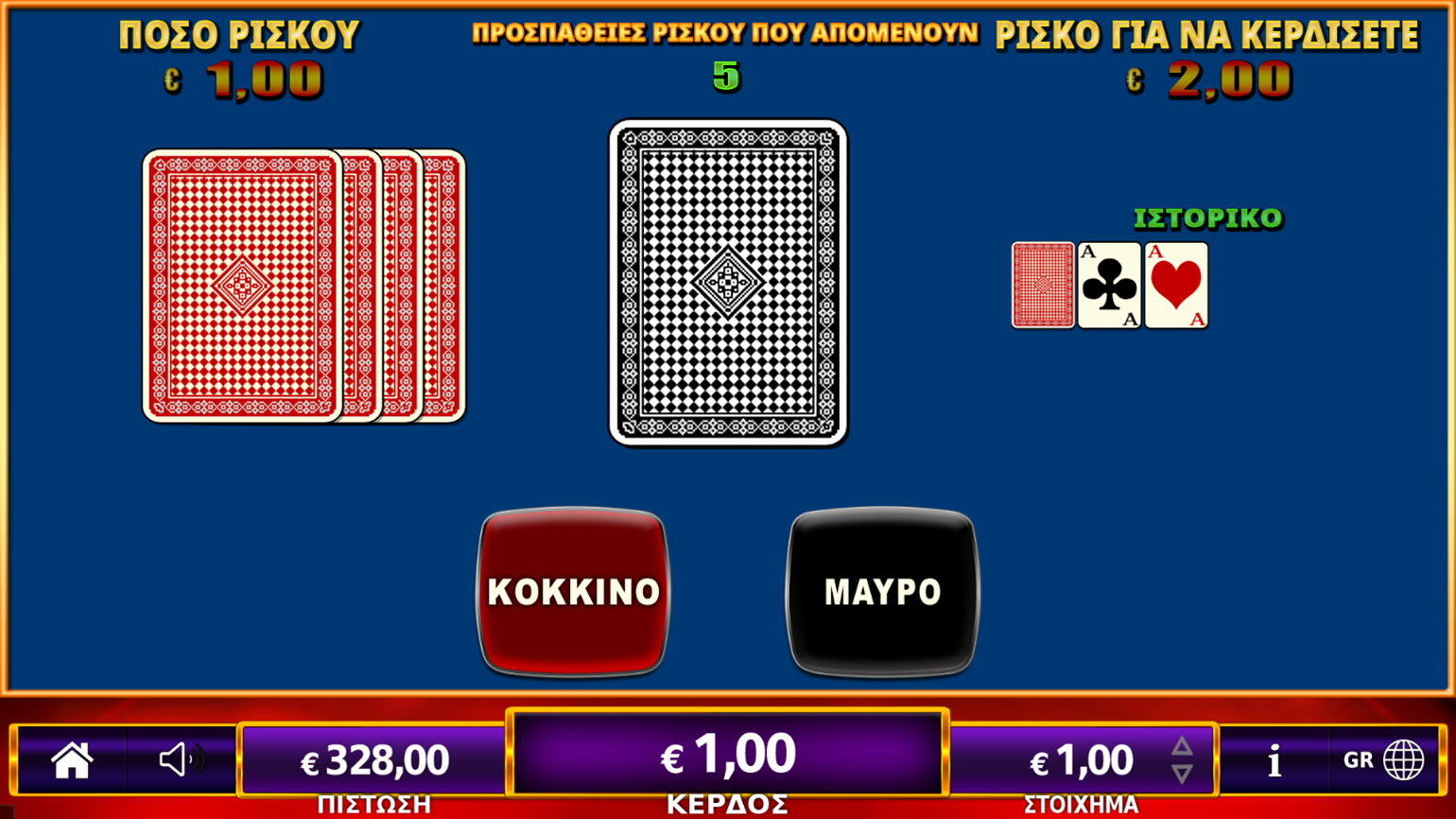 Στη συνέχεια επιλέξτε κόκκινο ή μαύρο. Εάν η επιλογή κόκκινο/μαύρο είναι σωστή το ποσό του ρίσκου διπλασιάζεται (Χ2). Εάν η επιλογή κόκκινο/μαύρο δεν είναι σωστή το ποσό του ρίσκου χάνεται και το παιχνίδι τελειώνει.