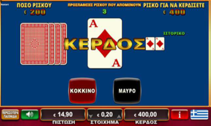 Για να ρισκάρετε οποιοδήποτε κέρδος μικρότερο του 2.500,00€ πατήστε το κουμπί ρίσκο. Εάν η επιλογή κόκκινο/μαύρο είναι σωστή το ποσό του ρίσκου διπλασιάζεται (χ2). Εάν η επιλογή κόκκινο/μαύρο δεν είναι σωστή το ποσό του ρίσκου χάνεται και το παιχνίδι τελειώνει. Η πιθανότητα κέρδους είναι 50%.