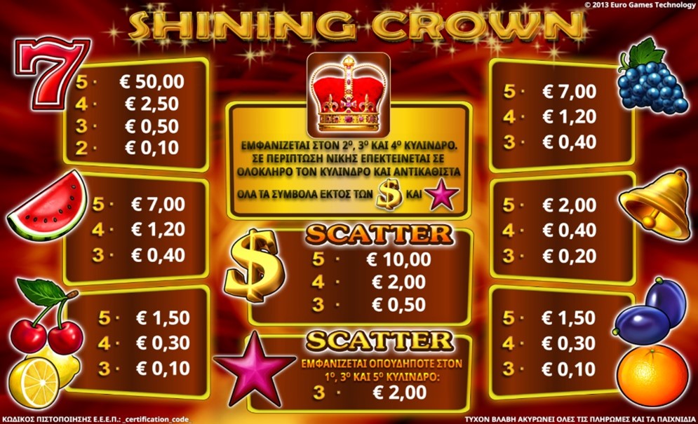 Το SHINING CROWN είναι ένα παιχνίδι με πέντε (5) κυλίνδρους και δέκα (10) γραμμές πληρωμής. Όλες οι πληρωμές αφορούν συνδυασμούς για όμοια σύμβολα και πληρώνουν από αριστερά προς τα δεξιά. Όλες οι πληρωμές πρέπει να είναι σε διαδοχικούς κυλίνδρους ξεκινώντας από τον πρώτο κύλινδρο αριστερά εκτός των Scatter. Τα κέρδη από τα Scatter προστίθενται στα κέρδη γραμμών πληρωμής.