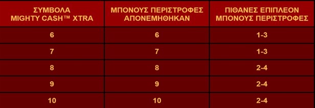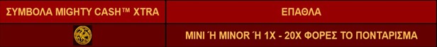 Σε κάθε μπόνους περιστροφή, οποιαδήποτε θέση που περιέχει σύμβολο mighty cash xtra