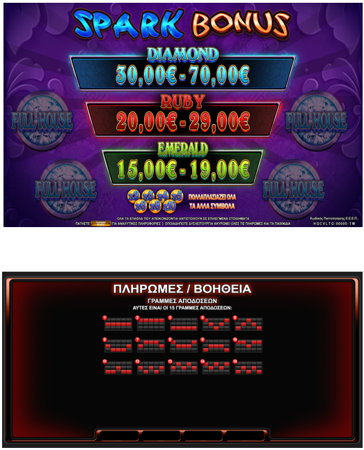 Το “ Spark of Wealth Bonus” είναι ένα παιχνίδι με 5 κυλίνδρους και 15 γραμμές πληρωμής. Όλοι οι νικητήριοι συνδυασμοί αποδίδουν από τα αριστερά προς τα δεξιά. Όλοι οι νικητήριοι συνδυασμοί πρέπει να βρίσκονται σε διαδοχικούς κυλίνδρους και να ξεκινούν από τον πρώτο κύλινδρο αριστερά. Πληρώνεται μόνο το υψηλότερο κέρδος ανά γραμμή.