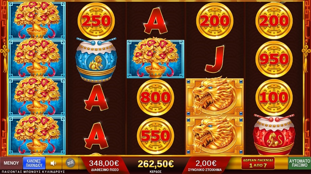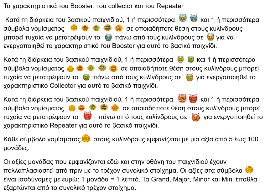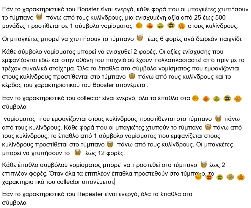 Οι αποδόσεις των συμβόλων αλλάζουν με βάση το ποντάρισμα και είναι διαθέσιμες στις οθόνες του παιγνιομηχανήματος.