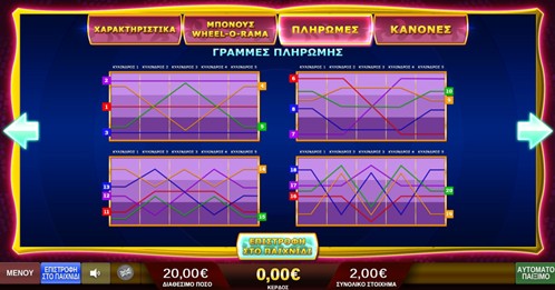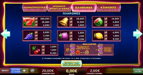 Το “ Super Wheel-O-Rama” είναι ένα παιχνίδι με 5 κυλίνδρους και 20 γραμμές πληρωμής.