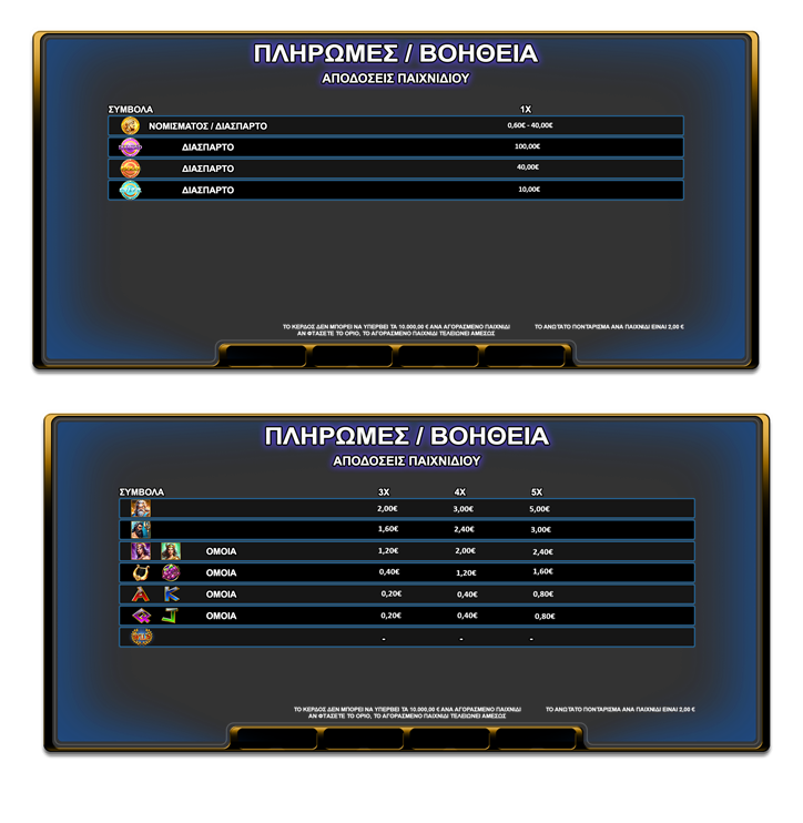 Οι αποδόσεις των συμβόλων αλλάζουν με βάση το ποντάρισμα και είναι διαθέσιμες στις οθόνες του παιγνιομηχανήματος.