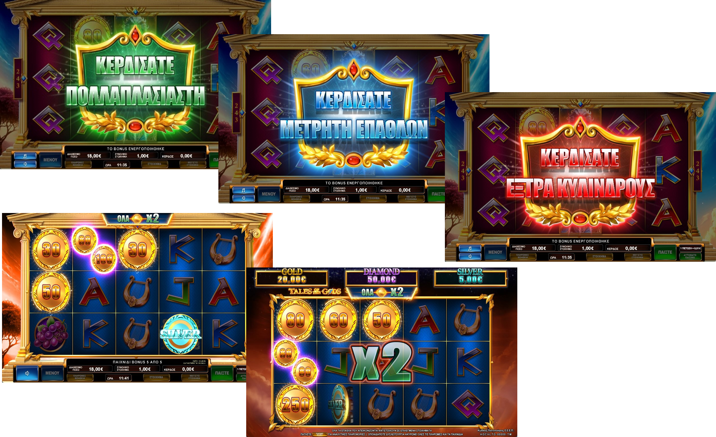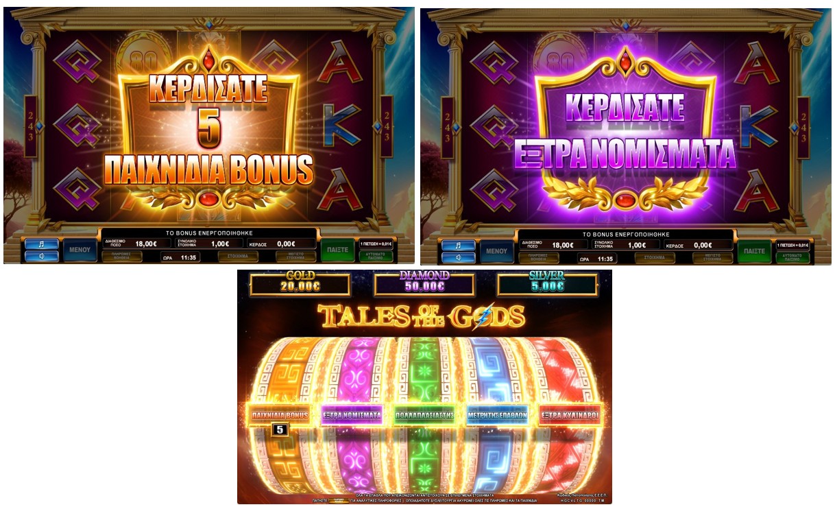 Το “Tales of the Gods ” είναι ένα παιχνίδι με 5 κυλίνδρους 243 πιθανούς νικητήριους συνδυασμούς. Όλοι οι νικητήριοι συνδυασμοί αποδίδουν από τα αριστερά προς τα δεξιά. Όλοι οι νικητήριοι συνδυασμοί πρέπει να βρίσκονται σε διαδοχικούς κυλίνδρους και να ξεκινούν από τον πρώτο κύλινδρο αριστερά. Πληρώνεται μόνο το υψηλότερο κέρδος ανά γραμμή.