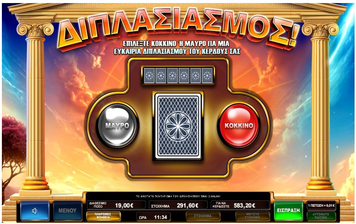 Πατώντας το πλήκτρο διπλασιασμού εμφανίζεται μια νέα οθόνη, όπου ο παίκτης μπορεί να επιλέξει ανάμεσα σε μια κόκκινη ή μια μαύρη κάρτα. Όταν ο παίκτης επιλέξει ένα από τα χρώματα, το παιχνίδι του διπλασιασμού αποκαλύπτει μια κάρτα και δείχνει το αποτέλεσμα του γύρου του παιχνιδιού. Αν αυτή η κάρτα έχει το χρώμα που επιλέχθηκε, το κέρδος διπλασιάζεται. Αν όμως η κάρτα δεν έχει το χρώμα που επιλέχθηκε, το συνολικό κέρδος χάνεται. Η πιθανότητα κέρδους είναι 50%.