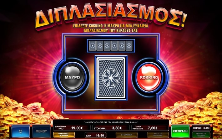 Πατώντας το πλήκτρο διπλασιασμού εμφανίζεται μια νέα οθόνη, οπού ο παίκτης μπορεί να επιλέξει ανάμεσα σε μια κόκκινη ή μια μαύρη κάρτα. Όταν ο παίκτης επιλέξει ένα από τα χρώματα, το παιχνίδι του διπλασιασμού αποκαλύπτει μια κάρτα και δείχνει το αποτέλεσμα του γύρου του παιχνιδιού. Αν αυτή η κάρτα έχει το χρώμα που επιλέχθηκε, το κέρδος διπλασιάζεται. Αν όμως η κάρτα δεν έχει το χρώμα που επιλέχθηκε, το συνολικό κέρδος χάνεται. Η πιθανότητα κέρδους είναι 50%.