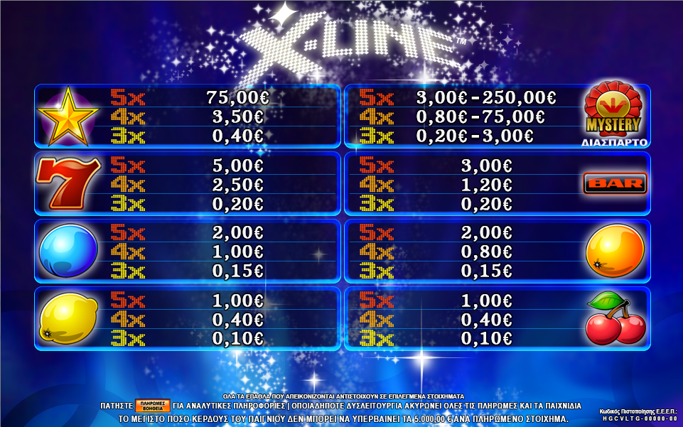 Το “X-LINE” είναι ένα παιχνίδι με 5 κυλίνδρους και 10 γραμμές πληρωμής όπου όλοι οι νικητήριοι συνδυασμοί αποδίδουν από αριστερά προς τα δεξιά, από τα δεξιά προς τα αριστερά και στη μέση . Όλοι οι νικητήριοι συνδυασμοί πρέπει να βρίσκονται σε διαδοχικούς κυλίνδρους. Πληρώνεται μόνο το υψηλότερο κέρδος ανά γραμμή.
