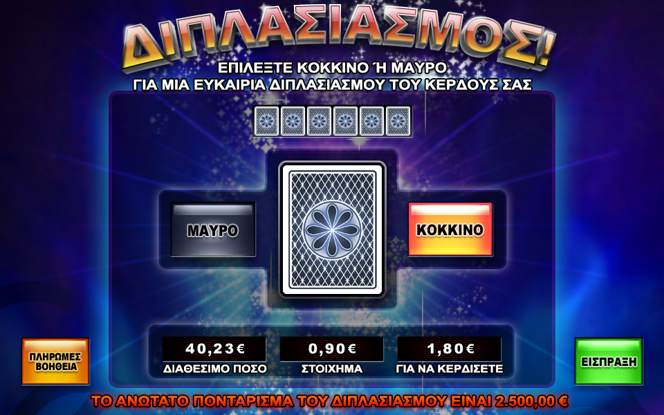 Πατώντας το πλήκτρο διπλασιασμού εμφανίζεται μια νέα οθόνη, οπού ο παίκτης μπορεί να επιλέξει ανάμεσα σε μια κόκκινη ή μια μαύρη κάρτα. Όταν ο παίκτης επιλέξει ένα από τα χρώματα, το παιχνίδι του διπλασιασμού αποκαλύπτει μια κάρτα και δείχνει το αποτέλεσμα του γύρου του παιχνιδιού.